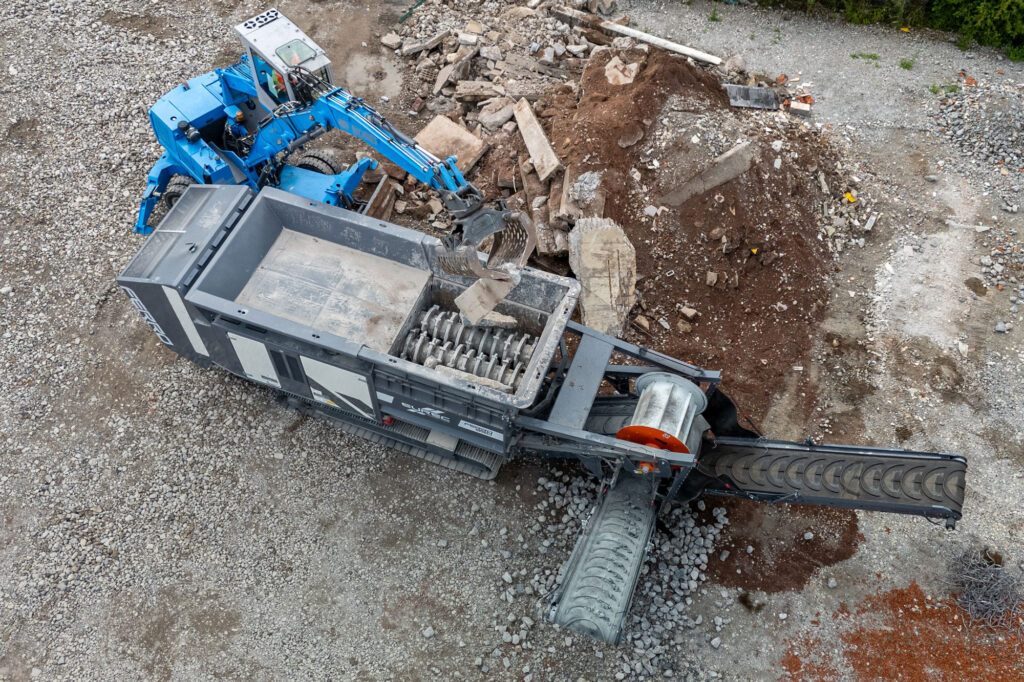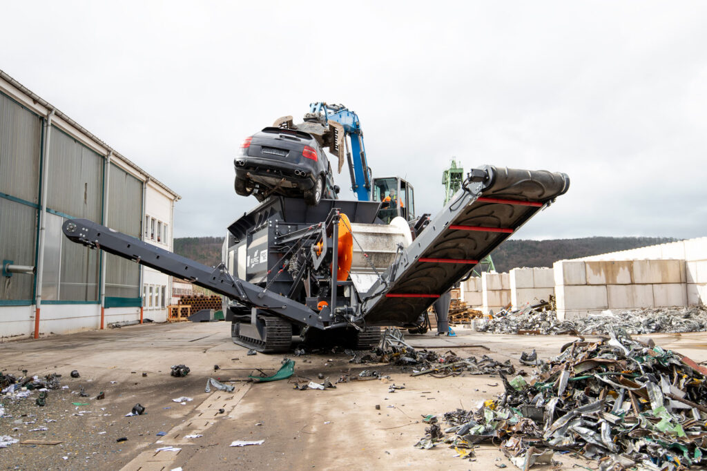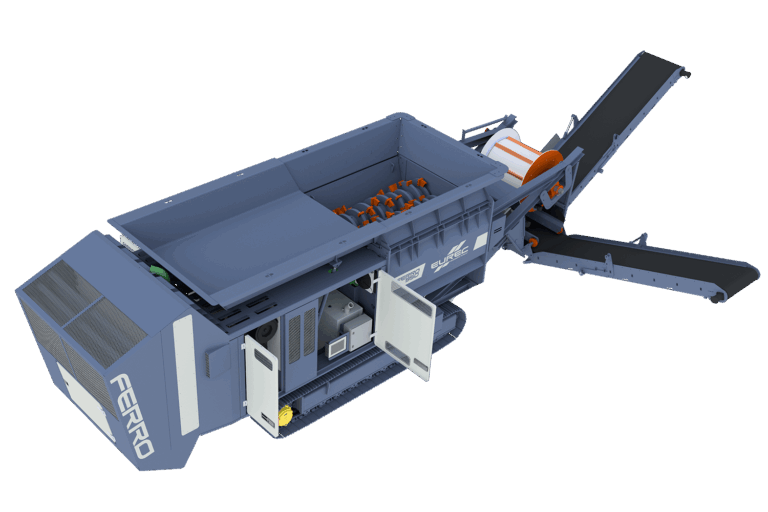 The FERRO 950 FE version has been specially designed for demanding applications with a high ferrous content. With a reinforced design, a powerful shredding system and an integrated magnetic drum for separating ferrous and non-ferrous components, the most powerful shredder on the market is suitable for extremely resistant material flows such as broken concrete and concrete railway sleepers with reinforcing steel, end-of-life vehicles and scrap metal.