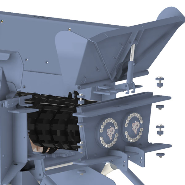 Thanks to the hydraulically lowerable breaker bar and the two movable side combs, worn shredding shafts can be replaced quickly and easily – only included with synchronised shaft configuration!
